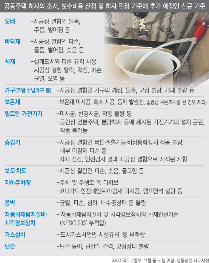 신설되는 하자판정 대상 기준 항목은 도배, 바닥재, 석재, 가구(주방·수납가구 등), 보온재, 가전기기, 승강기, 보도·차도, 지하주차장, 옹벽, 자동화재탐지설비·시각경보장치, 가스설비, 난간 등 13개 항목이다.