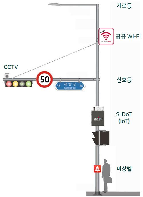 서울시가 최근 시범 설치 사업에 착수한 ‘스마트폴(smart pole)’ 모델 예시. 신호등과 가로등,  폐쇄회로(CC)TV, 공공 와이파이, 비상벨 등을 하나의 지주(pole)에 설치해 교통신호 제공과 야간 시야 확보, 방범 관리 등  다양한 기능을 구현할 수 있다. 서울시 제공