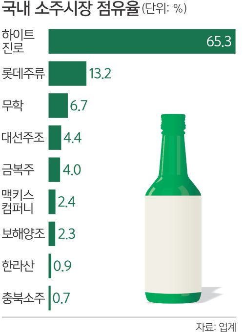 국내 소주 브랜드가 전국 점유율 65를 돌파한 것은 이번이 최초다. 소주를 즐기는 국민 10명 중 6명 이상은 ‘참이슬·진로’를 마신 셈이다. 특히 주류대기업인 하이트진로와 롯데주류의 전체 소주시장 점유율이 80%대에 육박해 사실상 국내 소주시장을 독점하고 있다.