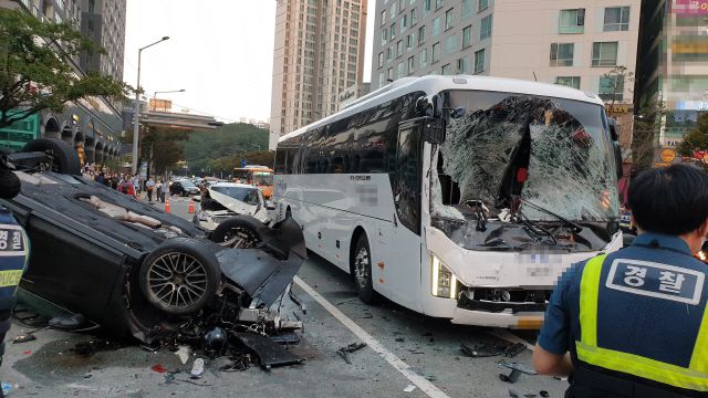 7중 추돌사고는 포르쉐 운전자가 앞서 가던 오토바이와 승용차를 잇따라 들이받으면서 시작됐다. 이후 맞은편 신호대기 중이던 버스와 승합차 등 5대와 잇따라 부딪힌 뒤 전복됐다. 피해 오토바이는 산산조각이 났고 피해 승용차는 거의 반파될 정도였다.