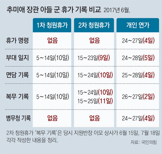 실제로 인사 명령 기록(6월 24∼27일)엔 4일 연가를 간 것으로 돼 있지만 부대 일지(6월 24∼28일)엔 5일, 면담 기록(6월 25∼28일)엔 4일, 복무 기록(6월 26, 27일)엔 2일 연가로 기록돼 있어 휴가 기간이 제각각이라는 것. 이 문건과 별개로 전주혜 의원이 병무청으로부터 제출받은 휴가 기록(연가 6월 24∼27일, 병가 기록은 없음)과도 다른 점이 많았다. 전 의원은 “병가에 대한 휴가 명령서도 없기에 병가인지 휴가인지 관리가 안 되니 아예 (병무청 기록에) 병가 입력을 안 한 것 아니냐”고 말했다.