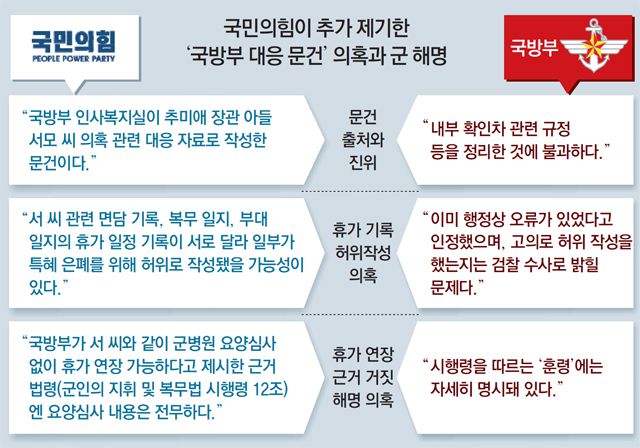 국민의힘은 해당 문건에 “입원 중이 아닌 장병의 청원휴가 연장은 관련 법령에 따라 군병원 요양심사 없이 연장이 가능하다”며 군인의 지위 및 복무에 관련 기본법 시행령 12조를 적시한 점도 비판했다. 지난주 서 씨가 군병원의 요양심사 없이 휴가를 연장해 규정을 어겼다는 의혹이 제기됐을 때 국방부는 이 문건의 논리대로 대응했다. 국민의힘은 “해당 법 시행령 12조 어디에도 요양심사에 대한 내용은 없다”면서 “국방부는 근거 없는 자료로 거짓 해명을 해 국민을 속이고 추 장관을 엄호하고 있다”고 비판했다. 군 관계자는 “시행령 자체가 아니라 이에 따른 ‘훈령’에 요양심사에 대한 내용이 자세히 명시돼 있다”고 반박했다.