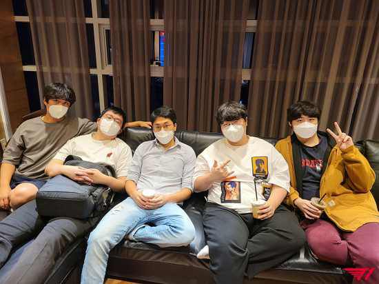 공개된 사진에는 T1 신사옥 소파에서 나란히 앉아 있는 블랭크, 푸만두, 뱅기, 울프, 뱅의 모습이 담겼다. 코로나19 여파로 마스크를 착용한 채 카메라를 응시하고 있다.