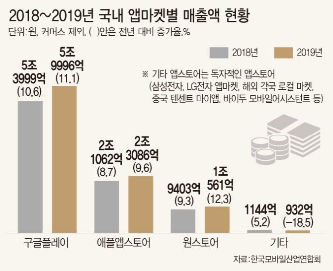 그런데 대한민국 앱 백화점은 외국 백화점들이 독점하고 있다. 한국모바일산업연합회에 따르면 구글(구글플레이)이 64.4%, 애플(애플앱스토어)이 24.4%로 둘을 합치면 87.8%다. 뒤이어 원스토어 11.2%, 기타(삼성·LG 앱마켓, 텐센트 마이앱 등)1.0% 순(2019년 매출기준)이다. 스마트폰 대중화로 앱 경제가 열렸는데 상점은 외국회사들이 독식하는 셈이다.