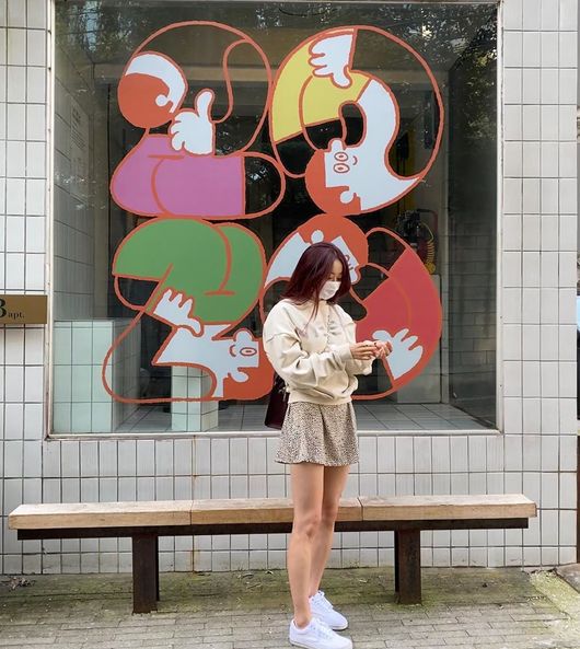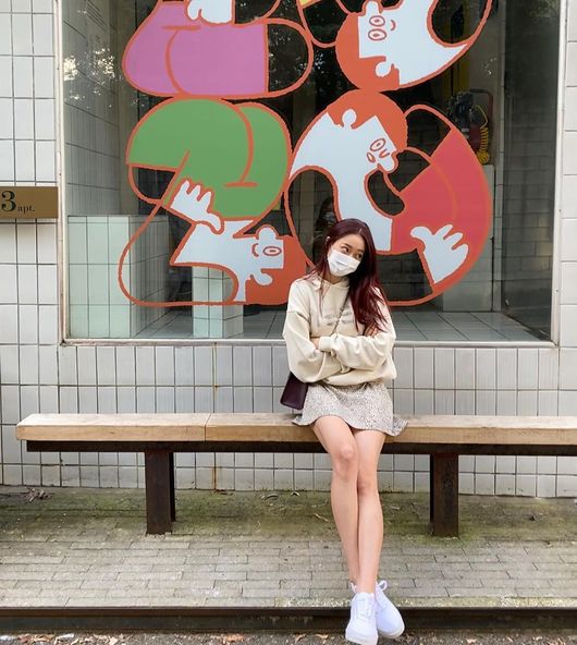 사진에는 건물 앞 벤치에 앉아 누군가를 기다리는 듯한 경리의 모습이 담겼다. 짧은 미니스커트를 입은 경리는 군살 없이 쭉 뻗은 젓가락 각선미를 뽐내고 있다.