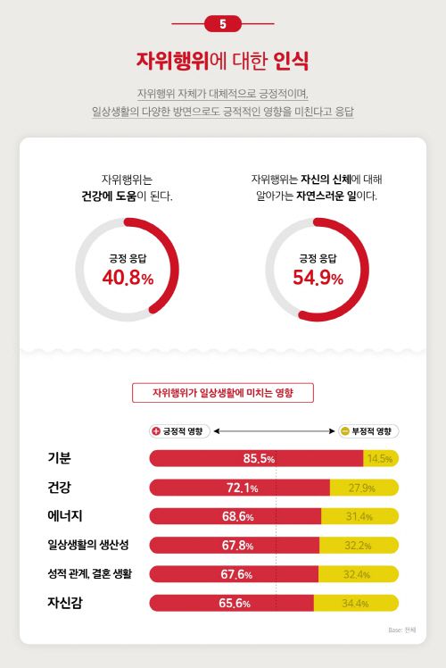 그럼에도 자위행위에 대해 대체적으로 긍정적 인식을 갖고 있는 것으로 나타났다. 자위행위가 ‘기분에 긍정적인 영향을 미친다’는 응답이 85.5%나 됐다. ‘건강’(72.1%), ‘에너지’(68.6%), ‘일상생활의 생산성’(67.8%), ‘성적 관계 및 결혼 생활’(67.6%), ‘자신감’(65.6%) 등의 순이었다. ‘자위행위가 자신의 신체에 대해 알아가는 자연스러운 일인지’ 묻는 질문에는 54.9%가 긍정적인 응답을 했다.