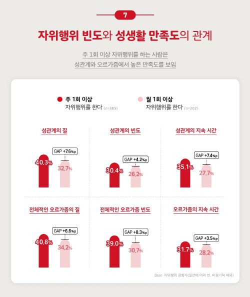 자위행위를 일주일에 한 번 이상 하는 성인남녀은 성관계와 오르가즘에서 높은 만족도를 보였다. 주 1회 이상 자위행위를 하는 사람의 40.3%가 성관계의 질에 대해 긍정 답변을 했다. 이는 월 1회 이상 자위를 하는 사람보다 7.6%p 높은 수치다. 또 주 1회 이상 자위행위를 하는 사람의 40.8%가 전체적인 오르가즘의 질에 대해 긍정응답을 했고, 이는 월 1회 이상 자위를 하는 사람보다 6.6%p 높은 수치다.