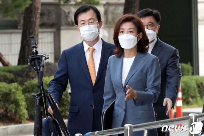 20대 국회 패스트트랙(신속처리안건) 충돌 사태로 기소된 나경원 전 미래통합당(국민의힘 전신) 의원이 지난 21일 오전 서울 양천구 서울남부지방법원에서 열린 공판에 출석하고 있다./사진=뉴스1
