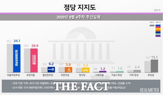 이날 여론조사 전문기관 리얼미터가 YTN 의뢰로 실시한 9월4주차(21일~25일) 주중 집계 결과 민주당 지지율은 전주보다 1.1%p 내린 34.1%, 국민의힘은 0.4%내린 28.9%로 조사됐다.