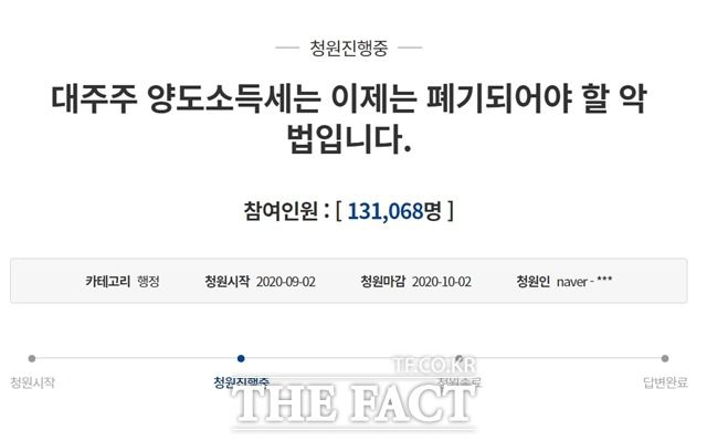 [더팩트ㅣ박경현 기자] 지난 2일 시작된 대주주 양도소득세와 관련해 폐지를 요구하는 청와대 국민청원 게시글의 참여인원이 13만 명을 돌파했다.