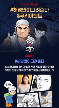 인스타그램에 음식을 찍은 사진을 올리면 허영만 작가가 그림을 직접 그려주며, 허영만 작가의 작품 ‘식객’ 50화 또는 단행본 5권을 보면 추첨을 통해 쿠키 100개를 증정한다. 또 10월4일까지 시리즈 만화 서비스의 장르별 작품을 감상하면 작품 이용권을 3∼5장씩 제공하는 혜택도 준비했다.