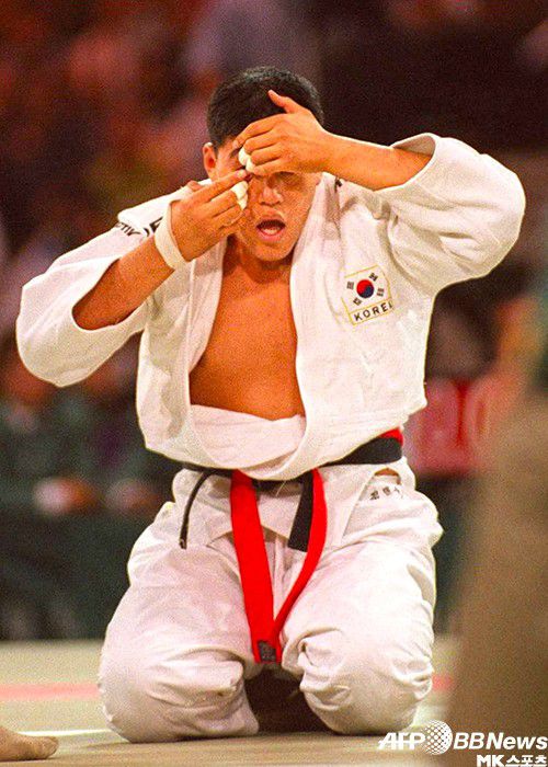 올림픽 은메달리스트 김민수가 유튜브 채널을 개설한다. 유도 기술을 알리고 과거 경기를 리뷰하는 콘텐츠를 제작한다. 애틀랜타올림픽 –95㎏ 4강전 도중 콘택트 렌즈가 빠져 다시 착용하는 김민수. 사진=AFPBBNews=News1 |