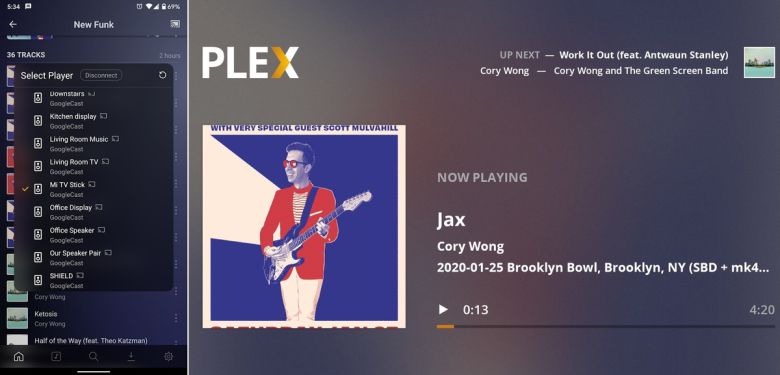 크롬캐스트를 지원하기 때문에 스마트폰 앱을 사용해(왼쪽은 Plexamp), TV에 미디어를 재생할 수 있다(오른쪽). © JARED NEWMAN / IDG