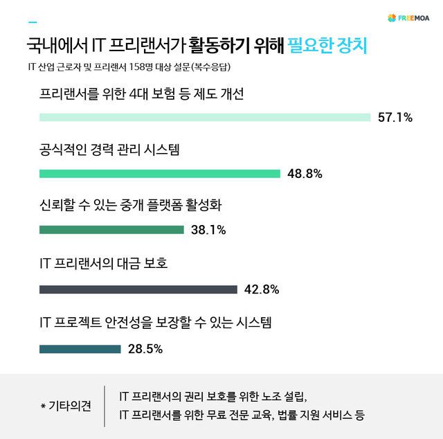 IT 아웃소싱 플랫폼 프리모아가IT 산업 근로자 및 프리랜서 158명을 대상으로 진행한 IT 프리랜서 근무 및 고용 환경에 대한 설문 조사에 따르면, IT 산업 종사자들은 국내에서 IT 프리랜서가 활동하기 위해 필요한 장치로 '프리랜서를 위한 4대 보험 등 제도 개선(57.1%, 복수응답)'을 가장 중요하게생각하는 것으로 나타났다.