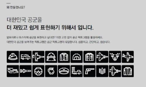 픽토그램이란 교통 표지판이나 비상구 안내 표지처럼 의미를 쉽게 알 수 있도록 단순화한 그림 문자를 말한다. 공군은 항공기, 의복, 무기, 계급 등 26개의 카테고리로 분류해 1차로 430여 개를 픽토그램을 제작했다.