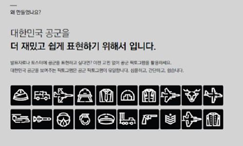 공군은 항공기, 의복, 무기, 계급 등 26개의 카테고리로 분류해 1차로 430여 개를 픽토그램을 제작했다. 공군본부 미디어콘텐츠과 김현준(22) 상병이 기획과 제작을 맡았다. 김 상병은 “공군 픽토그램은 공군을 국민들에게 더욱더 쉽고 재밌게 표현하기 위해 기획한 브랜드”라며 “앞으로 국민뿐 아니라 외국군과도 쉽게 소통할 수 있는 디자인 브랜드로 거듭나길 바란다”고 말했다.