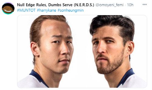 유럽 축구 관련한 한 SNS에서 금발의 넓은 이마를 가진 손흥민과 검은 머리카락의 케인의 합성 사진을 게재했다. 사진 속 인상을 쓰고 있는 손흥민의 진지한 모습은 다소 어색해 보이는데 반해 케인의 모습은 크게 이질감이 없다.
