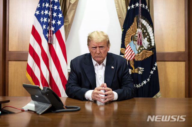 [베데스다=AP/뉴시스]백악관이 제공한 사진에 도널드 트럼프 미국 대통령이 4일(현지시간) 미 메릴랜드주 베데스다의 월터 리드 국립 군 병원에 마련된 전용 집무실에서 전화 회의를 하고 있다. 2020.10.05. |