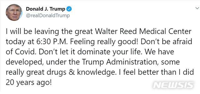 트럼프 대통령은 이날 트위터를 통해 "이날 오후 6시30분 훌륭한 월터 리드 의료센터를 떠날 것"이라며 "기분이 매우 좋다! 코로나를 두려워 하지 말라. 당신의 삶을 지배하게 두지 말라"고 발표했다.