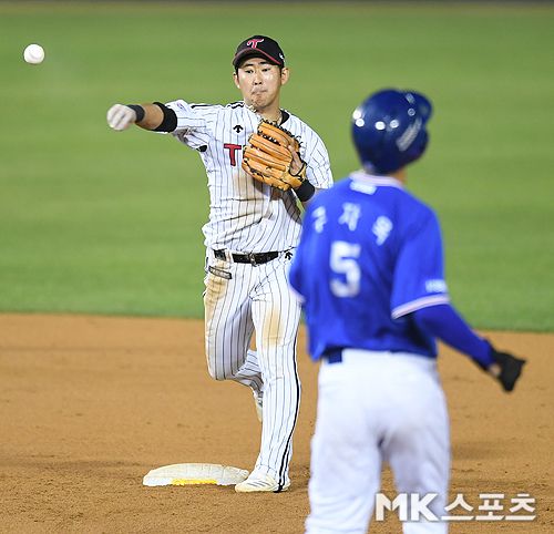 8회초 무사 1루에서 LG 정주현이 삼성 김동엽의 땅볼을 병사롤 연결하고 있다