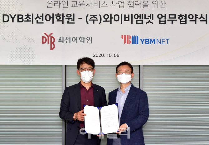 [이데일리 김태형 기자] 오재환(오른쪽) YBM넷 대표와 송오현 DYB최선어학원 대표가 6일 경기도 YBM넷 판교 사옥에서 온라인 교육서비스 사업 협력을 위한 업무협약을 체결하고 있다. 양사는 이번 업무협약으로 전략적 파트너쉽을 맺고 온라인 교육서비스 사업 전반에 걸쳐 상호 협력할 계획이다. (사진=YBM넷) 이 기사의 카테고리는 언론사의 분류를 따릅니다.0공유하기