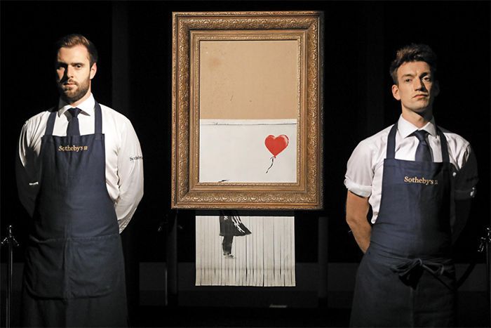 2018년 영국 런던의 소더비 경매에서 낙찰된 직후 파쇄기로 세절하는 기행으로 화제와 논란을 불렀던 뱅크시의 '풍선과 소녀'. 마노엔터테인먼트. |