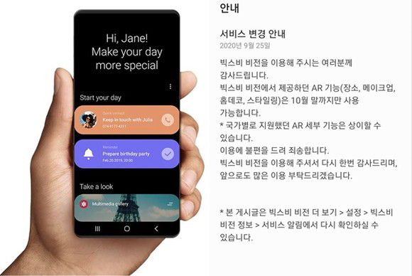8일 삼성전자에 따르면 2017년 시작했던 빅스비 비전에 담긴 일부 증강현실(AR)기능을 이달 말까지 운영한 후 중단한다. 국내의 경우 장소와 메이크업, 홈 데코, 스타일링 서비스가 대상이다. 국가별로 지원했던 AR 세부 기능은 다를 수 있다. 삼성전자는 지난달 25일 이같은 내용을 공지를 통해 소비자들에게 알렸다.