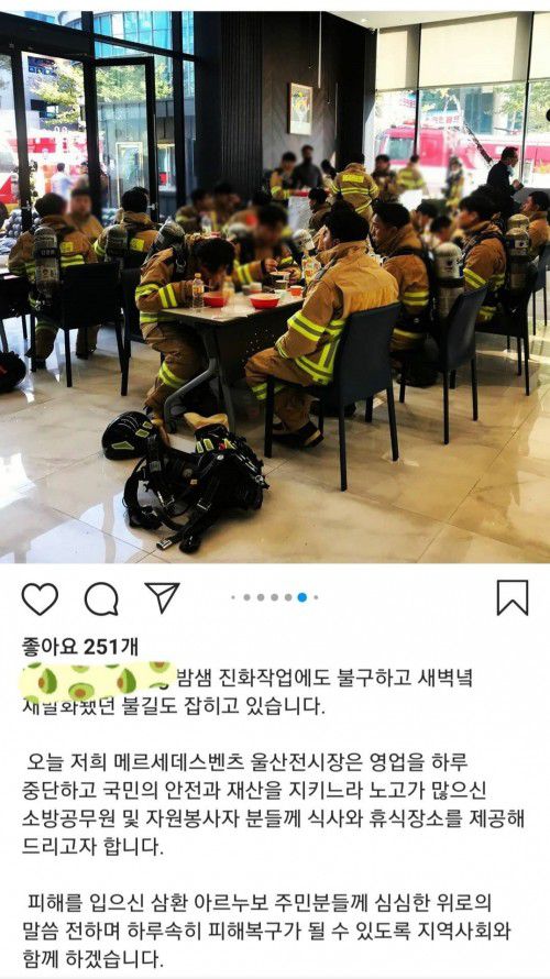 벤츠 딜러사인 스타자동차에 근무하고 있는 A씨는 자신의 인스타그램을 통해 "오늘 저희 메르세데스 벤츠 울산 전시장은 영업을 하루 중단하고 국민의 안전과 재산을 지키느라 노고가 많은 소방공무원 및 자원봉사자분들께 식사와 휴식 장소를 제공해 드리고자 한다"고 밝혔다.
