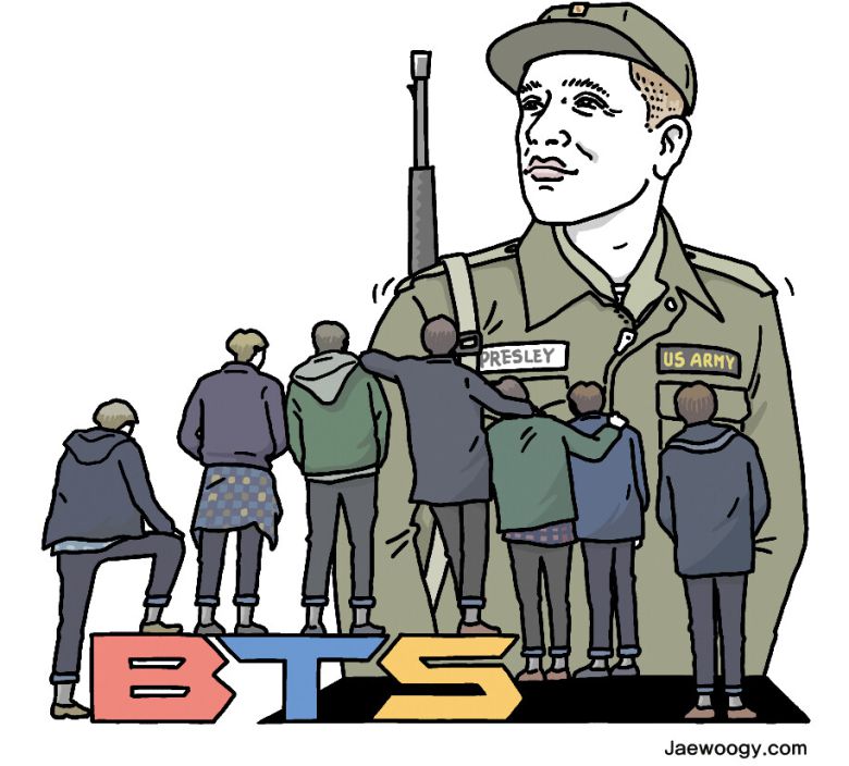 방탄소년단(BTS) 병역특례 허용 논란이 뜨겁다. 정작 멤버들은 입대 뜻을 분명하게 밝혔건만, 정치권이 나서서 논란을 키웠다. 슈퍼스타가 된 뒤 병역 문제가 불거졌다는 점에서, 방탄소년단은 비틀스보다는 프레슬리와 닮았다. 무엇보다 징병제 국가 중 한국처럼 큰 폭의 병역특례 제도를 운용하는 나라는 거의 없다. 형평성 논란 소지가 큰 예외조처를 계속 확대하는 게 능사일 순 없다. 손원제 논설위원 wonje@hani.co.kr