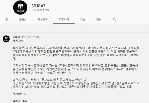 12일 무사트(MUSAT) 측은 공식 유튜브 계정에 공지사항을 게재했다. 해당 공지사항에는 최근 화제와 동시에 가학성 논란이 된 '가짜 사나이2' 훈련 과정에 대한 무사트 측의 입장과 동시에, 이근 대위의 소속 여부에 공식 입장을 밝혔다.