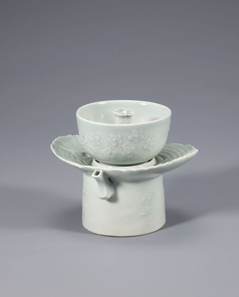 '백자 양각 매화무늬 계영배'의 내부 이미지. 잔 내부에 관이 있어서 일정량의 술을 따르면 대기압으로 인해 잔 밑에 있는 그릇으로 술이 빠져나간다. 이것을 '사이펀'이라고 한다. /국립중앙박물관 |