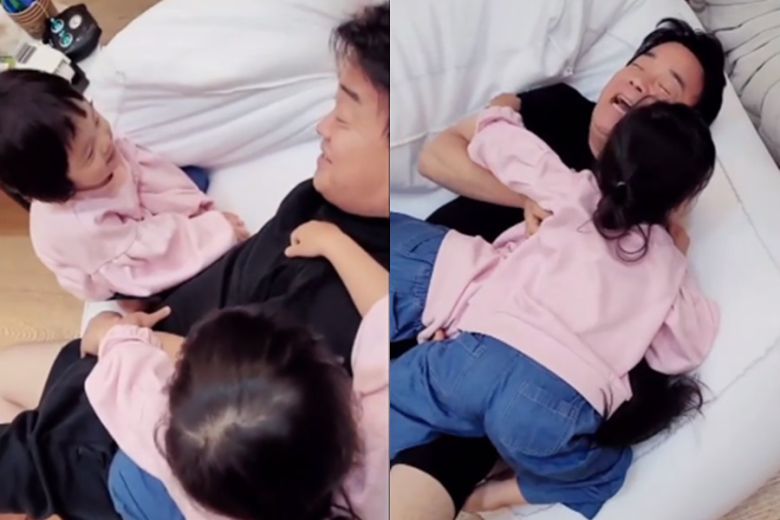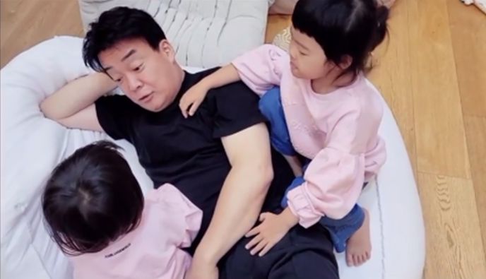 공개된 영상에는 나란히 분홍색 상의와 청바지를 착용한 두 딸이 백종원에게 매달려있는 모습이 담겼다.