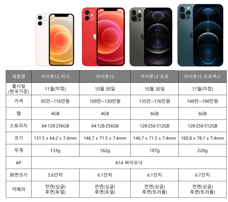 메모리는 아이폰12 미니와 아이폰12가 64·128·256GB 용량으로, 프로와 프로 맥스는 128·256·512GB 용량으로 출시된다.