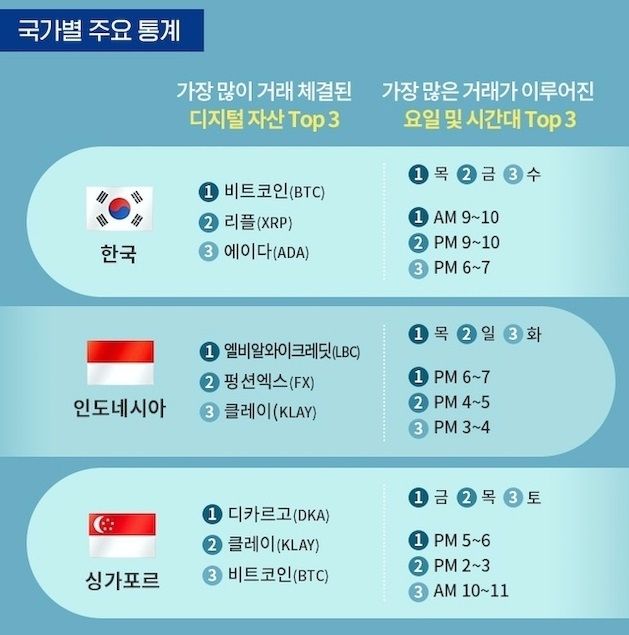 그 동안 가장 많이 거래된 가상자산을 살펴보면 한국은 비트코인(BTC), 인도네시아의 경우 엘비알와이크레딧(LBC), 싱가포르는 디카르고(DKA)로 기록됐다.