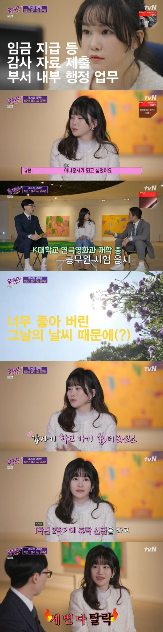 김규현 주무관은 공무원 시험을 치르게 된 계기에 대해 "특별한 계기가 있었다기 보다 9월에 개강을 하지 않냐. 서점에서 강의 들을 교재를 샀다. 그날 날씨가 너무 좋더라. 갑자기 학교가 가기 싫더라. 중도 휴학 신청서를 제출하고 책도 다시 환불하고 집으로 돌아왔다"라며 회상했다.