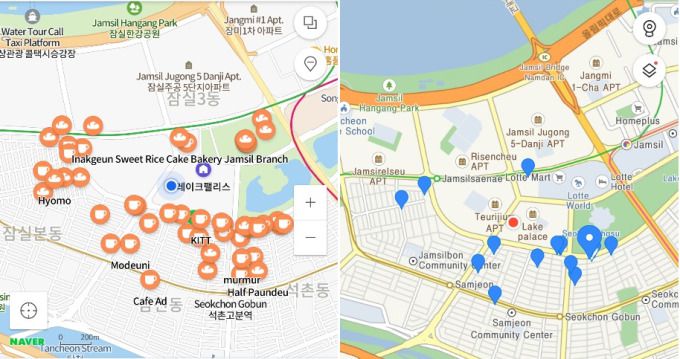 뉴스핌은 이와 관련해 네이버지도·카카오맵 양사 담당자 취재는 물론, 서울 송파와 은평, 경기 고양 등 여러 지역에서 카페·식당 등 주변 상권을 네이버지도와 카카오맵을 통해 검색해 봤다. 결론적으로 두 지도 서비스 간 검색 결과 차이는 존재했지만 300대 10 수준의 유의미한 차이는 발견하지 못 했다.