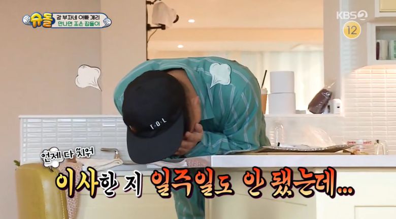 뒤늦게 이를 확인한 개리는 "오 마이 갓. 우리 이러면 밥 못 먹어"라며 당황했고, 정인은 "우리집 아니라 다행이다"라면서 아이들을 달랜 후 청소를 시작했다.