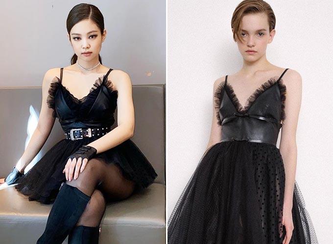 제니가 벨트로 허리선을 강조한 반면 모델은 캐미솔 톱 형태를 그대로 살려 입었다.