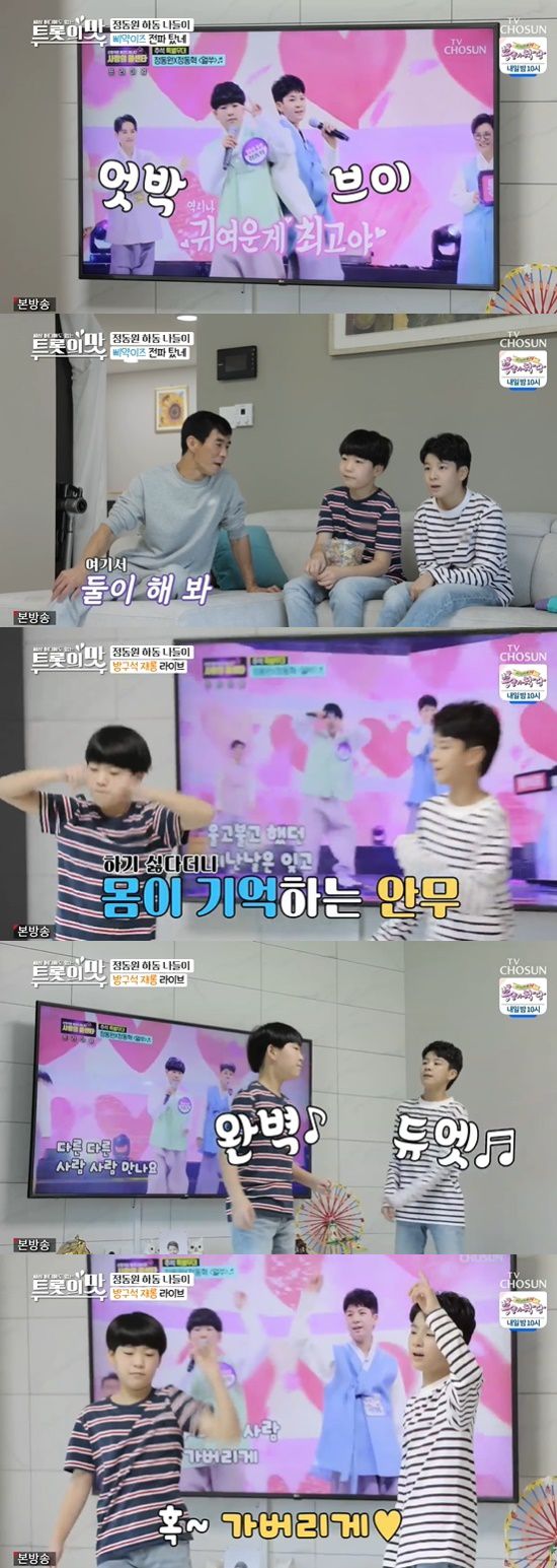 한편 정동원은 하동 집에 왔다. 정동원 아버지는 정동원을 위해 닭볶음탕을 만들며 기다리고 있었고, 정동원은 중학교 교복을 보여주었다. 정동원 아버지는 정동원에게 "중간고사 보지 않았냐"라며 성적표를 물어봤고, 정동원은 모른 척했다. 이어 가족들은 함께 정동원과 정동원 동생 정동혁이 '사랑의 콜센터'에 출연한 영상을 봤다. 정동원 아버지는 앞에서 한번 해보라고 했고, 형제는 하기 싫다면서도 '얼쑤' 안방 버전 무대를 선보였다.