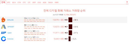 국내 4대 거래소 순위.  출처 | 코인힐스