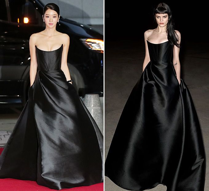 이날 서예지는 독특한 코르셋 형태의 톱이 돋보이는 실크 드레스를 착용하고 우아함을 자아냈다.