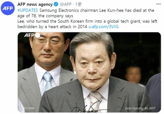 전 세계 외신들도 삼성 이건희 회장 별세 소식을 긴급 타전했다. [AFP통신 트위터] |