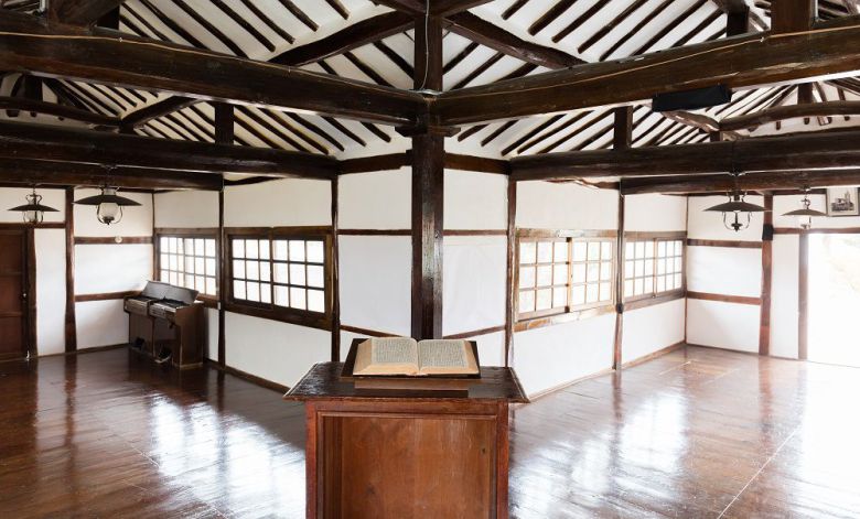 1920년대 후반에 지어진 것으로 알려진 전북 익산의 두동교회 내부. 기역자로 꺾은 특이한 구조로 남녀 좌석을 구분해 서로 상대편이 보이지 않도록 했다. /박종인 기자 |