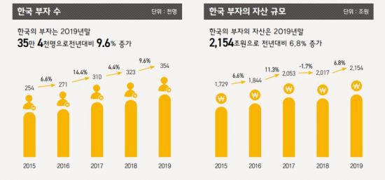 28일 KB금융그룹이 한국 부자의 현황과 자산운용 방법 등을 분석해 발간한 ‘2020 한국부자(富者)보고서’에 따르면 2010년 16만명이던 한국의 부자 수는 2019년에 35만4000명으로 10년만에 2.2배로 증가했다. 매년 9.2%씩 늘어난 수치로, 세계 부자 수가 같은 기간 중 매년 6.8%씩 늘어나고 한국 전체인구가 4.3%(연평균 0.47%) 증가한데 비해 높은 증가세다.