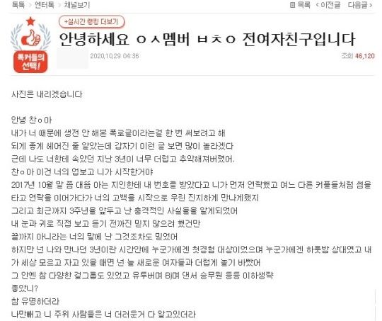 자신을 찬열의 전 여자친구라고 주장한 A씨는 29일 온라인 커뮤니티 게시판에 '안녕하세요 ㅇㅅ멤버 ㅂㅊㅇ 전 여자친구입니다'라는 제목으로 글을 올렸다.