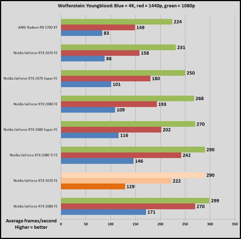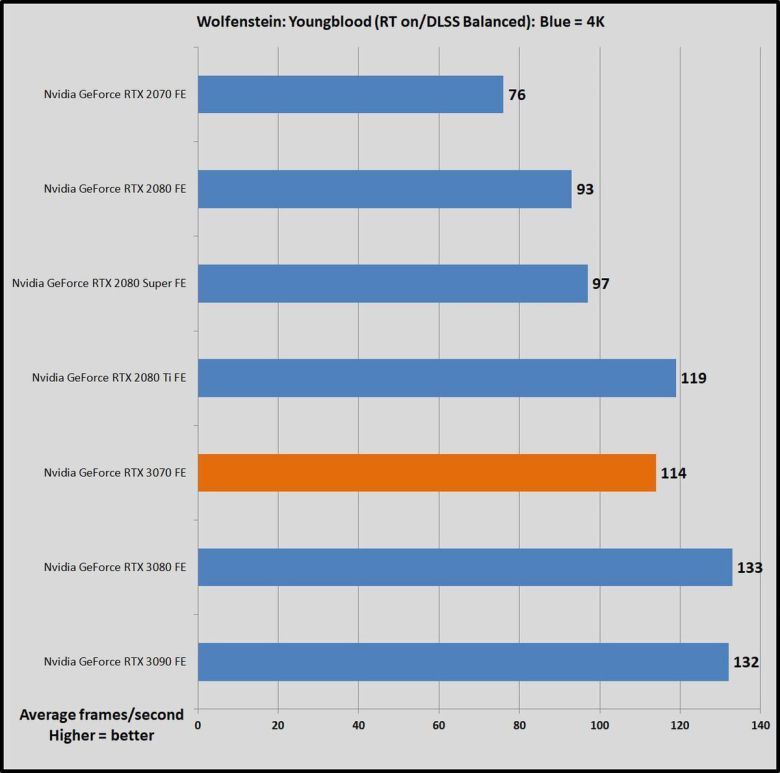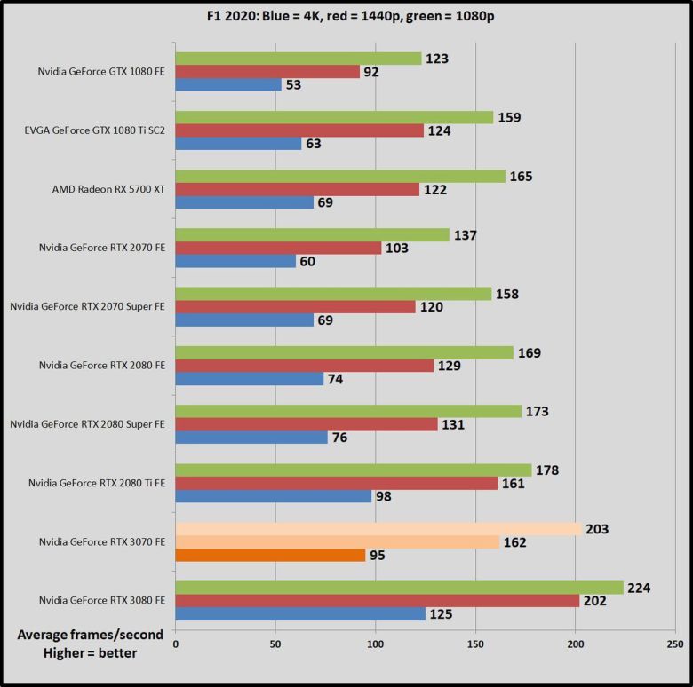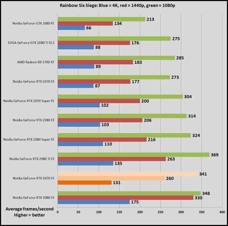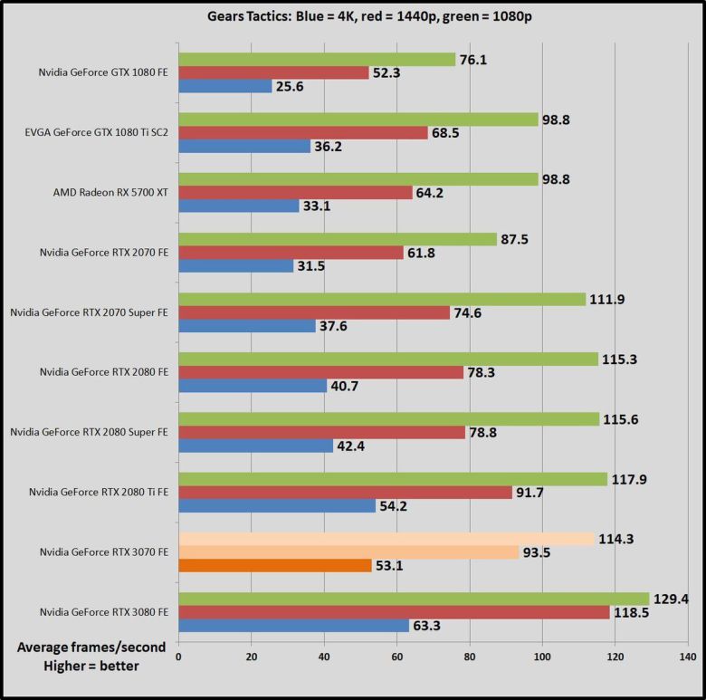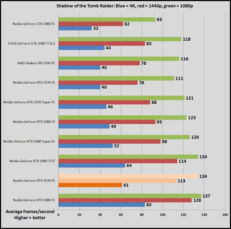 가격이 500달러로 같은 이전 세대 지포스 RTX 2070과 비교하면, GPU 작업에서 RTX 2070이 45~69% 더 느리다. 한 세대만에 비약적으로 발전한 것이다(RTX 2070은 비슷한 가격의 GTX 1080보다 많이 빠르지 않았다). RTX 3070은 강력한 성능 덕분에, 1440p, 심지어 4K 해상도에서도 레이트레이싱을 켜서 게임을 즐길 수 있다. 이 상태에서도 상당히 뛰어난 프레임률을 구현할 수 있다. RTX 2070은 이 정도는 아니었다.