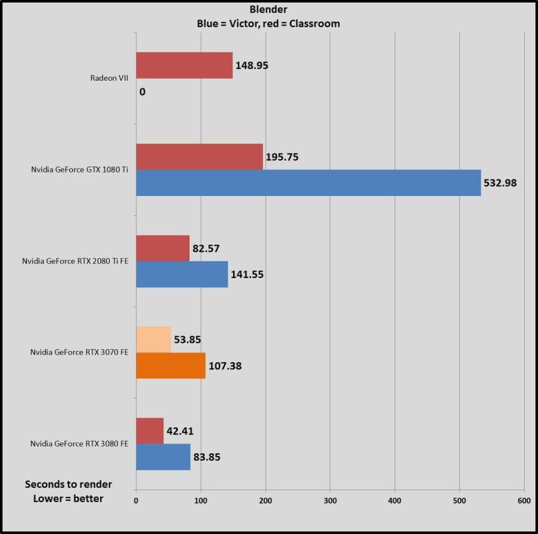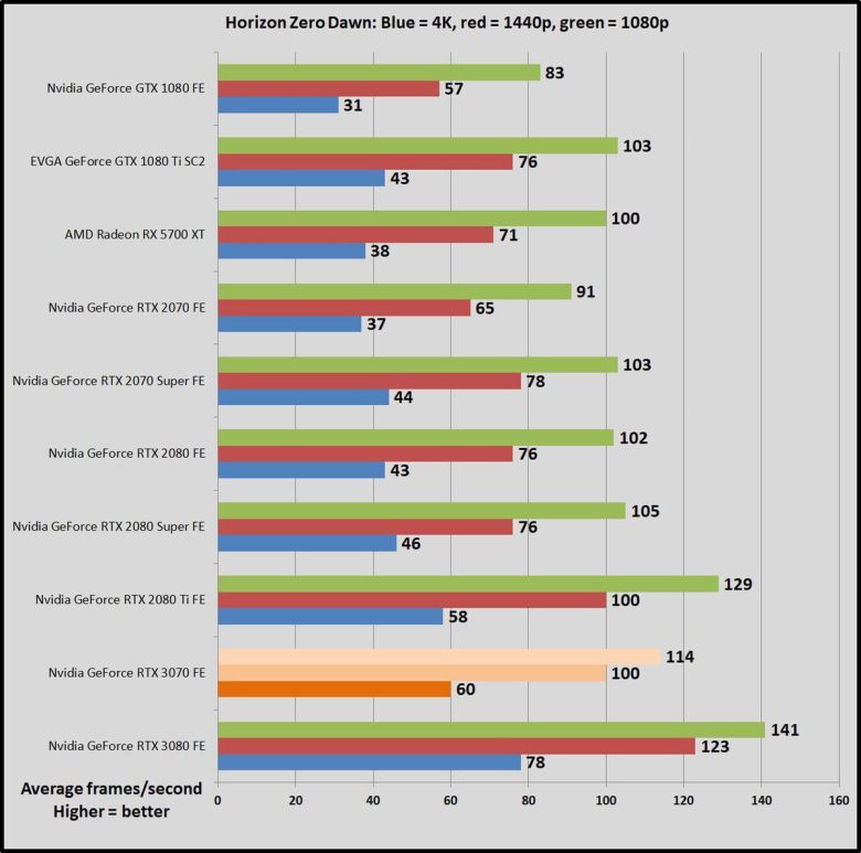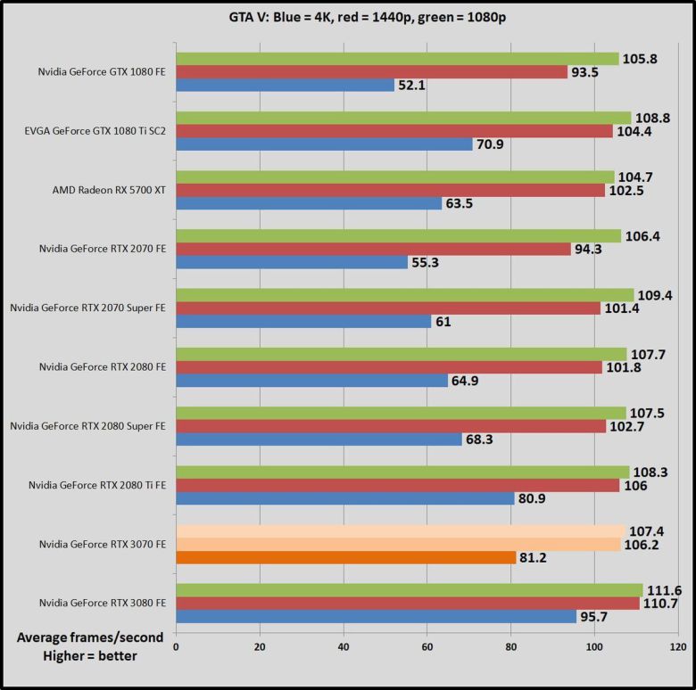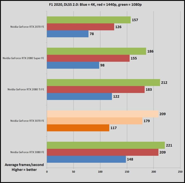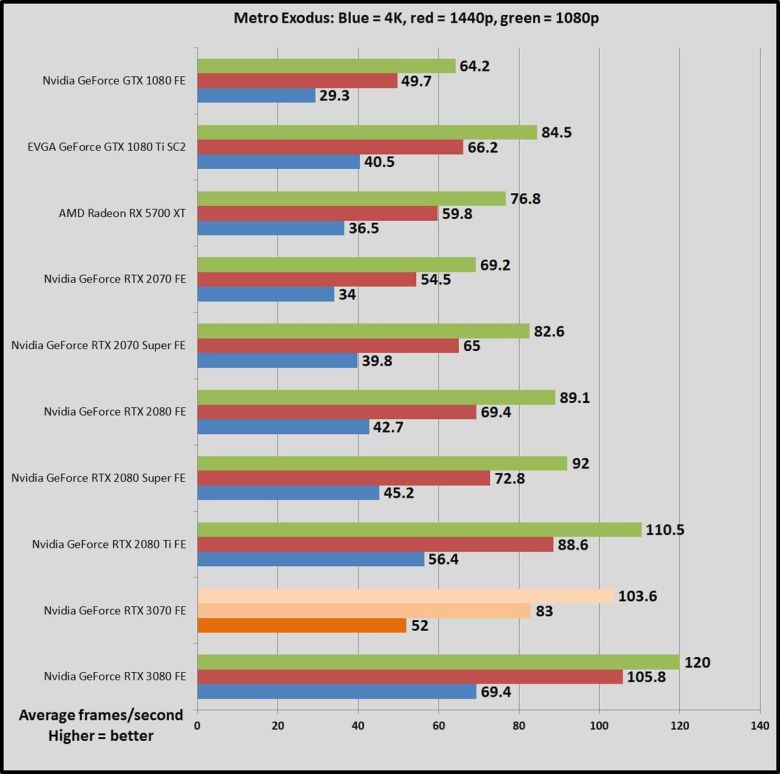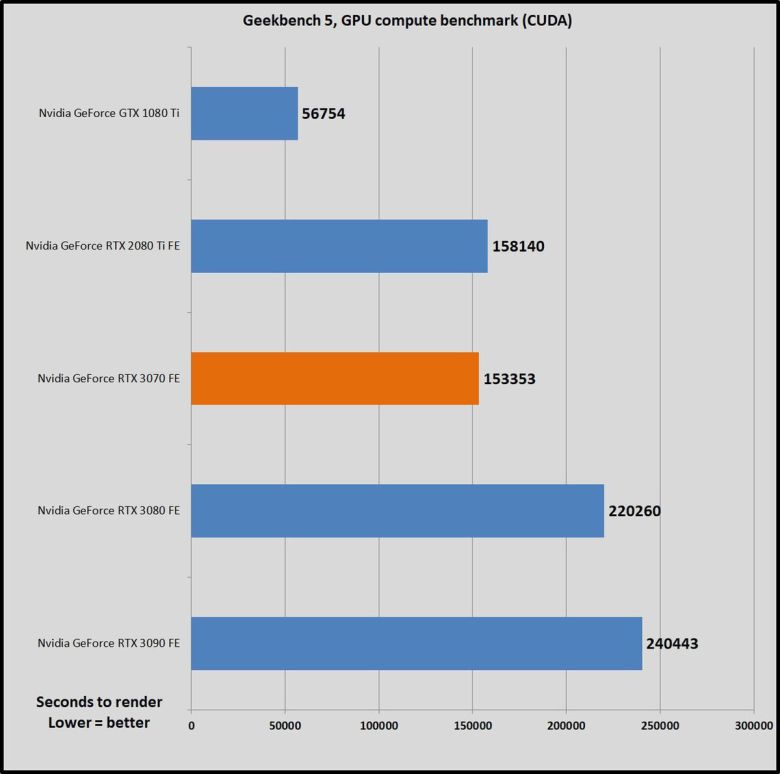 가격이 500달러로 같은 이전 세대 지포스 RTX 2070과 비교하면, GPU 작업에서 RTX 2070이 45~69% 더 느리다. 한 세대만에 비약적으로 발전한 것이다(RTX 2070은 비슷한 가격의 GTX 1080보다 많이 빠르지 않았다). RTX 3070은 강력한 성능 덕분에, 1440p, 심지어 4K 해상도에서도 레이트레이싱을 켜서 게임을 즐길 수 있다. 이 상태에서도 상당히 뛰어난 프레임률을 구현할 수 있다. RTX 2070은 이 정도는 아니었다.