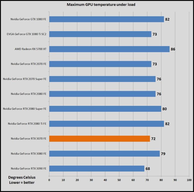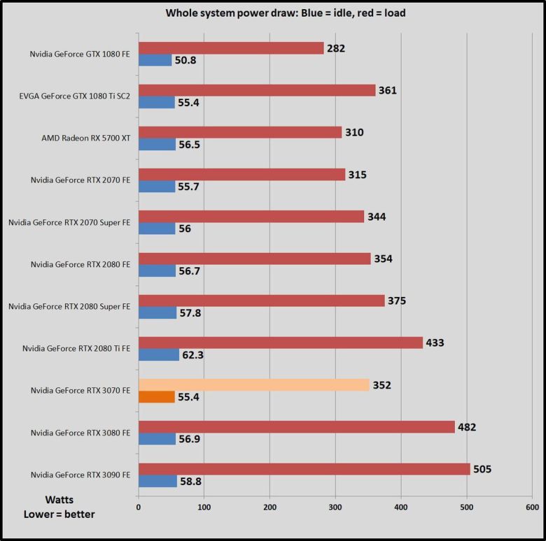 RTX 3080과 RTX 3090은 강력한 그래픽 카드라는 평을 얻었다. 지포스 RTX 3070은 암페어 GPU가 기존 RTX 20 시리즈에 내장된 튜링 GPU보다 전력 효율성이 높다는 점을 보여준다. 지포스 RTX 3070은 이전 세대 플래그십 제품인 RTX 2080 TI에 버금가는 성능을 전달하면서도 전력을 30와트 적게 사용한다. 8핀 커넥터를 2개가 아닌 1개만 쓰는데, 그래도 RTX 2070보다는 소비 전력이 70W 많다. RTX 2070의 경우 덜 강력한 파워 서플라이로 구동할 수 있다.