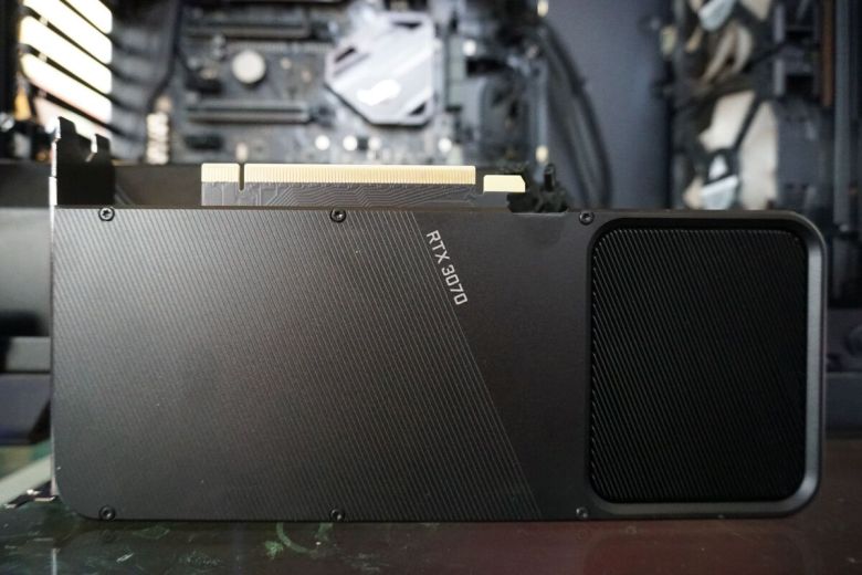 그렇지만 지포스 RTX 3070은 조금 차이가 있다. 푸시-풀 구성으로 카드 밑면과 윗면에 팬을 1개씩 배치하지 않고, RTX 3070 FE는 카드 앞면에 두 팬을 모두 배치하고, 맨 위에 얇은 백플레이트를 추가했다. 두 팬은 히트 싱크를 통해 공기를 내보낸다. 카드 뒷부분의 블로워 스타일 팬은 3070 FE의 I/O 브래킷을 통해 열을 내보낸다. 다른 쪽 팬은 뜨거운 공기를 백플레이트의 컷 아웃 부분을 통해 시스템 맨 위로 보내, 케이스 후면 팬이 이를 빨아들여 내보내도록 만든다. 작동 방식은 더 강력한 RTX 30 시리즈 카드의 쿨러와 같다. 그러나 경로에 차이가 있다.