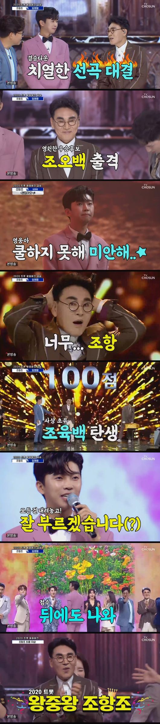 모두 기대 속에서 임영웅은 93점을 기록, 이로써 영광의 왕중왕은 조항조가 됐다. 모두 "조육백이 해냈다"며 감탄, 조항조는 트롯 마스터의 트로피 증정식을 받았고 우승상금 3백만원과 무대 의상도 선물로 받았다.